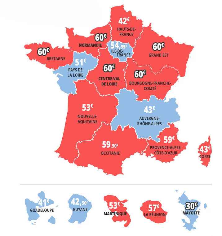 En Nouvelle-Aquitaine, le prix du CV fiscal est de 53€ pour un véhicule de – 10 ans (abattement pour les plus de 10 ans).